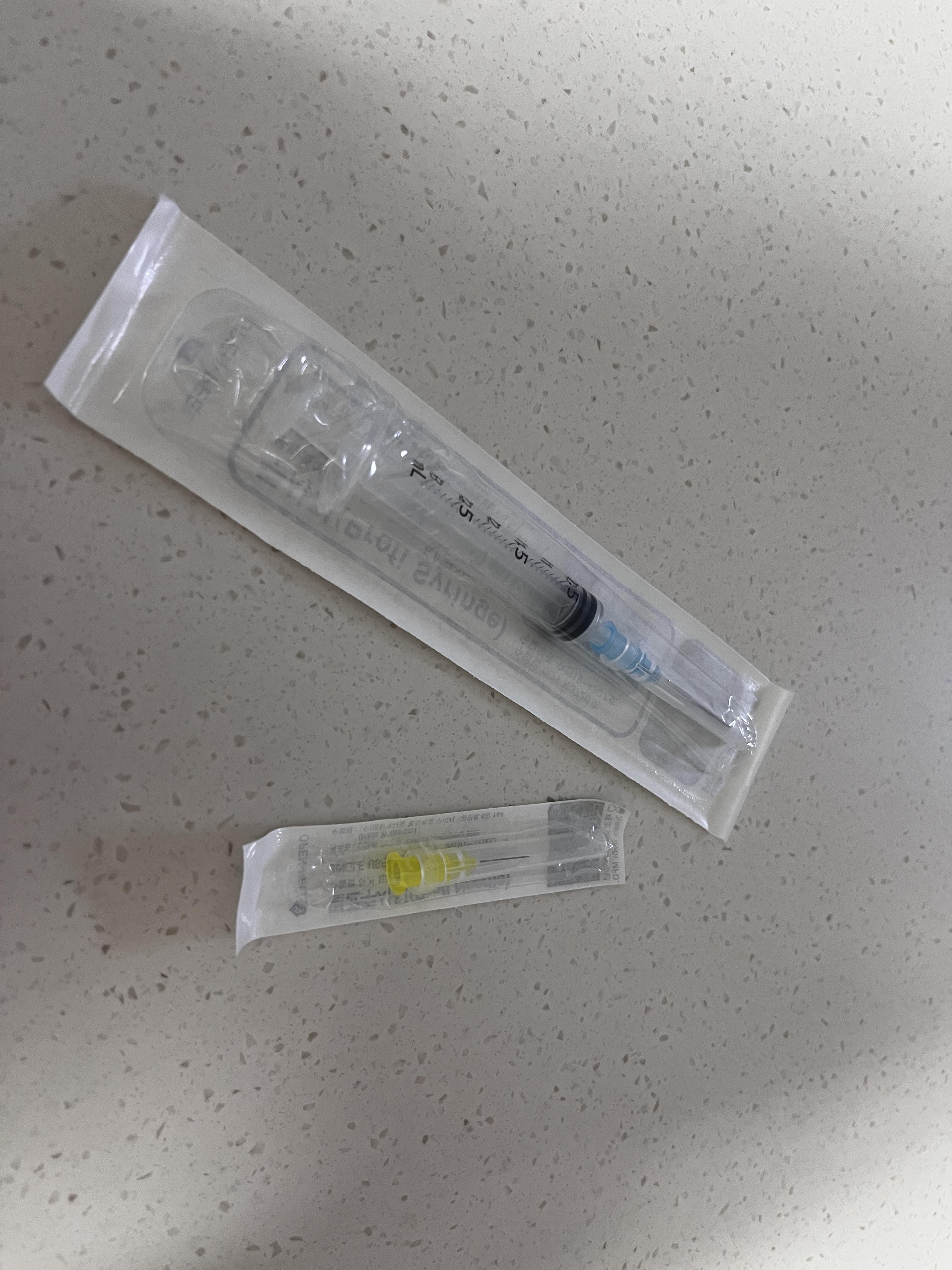 이 주사는 익숙합니다. 하나는 액체형 하나는 가루형인데 큰 주사기로 우선 액체를 뽑아낸 다음에 가루약병에 액체약병을 옮기고 서로 섞어 줍니다. 다시 큰 주사기로 섞인 액체를 빼낸 다음 작은 주사기로 교체해서 배에 주사하는 방식입니다.